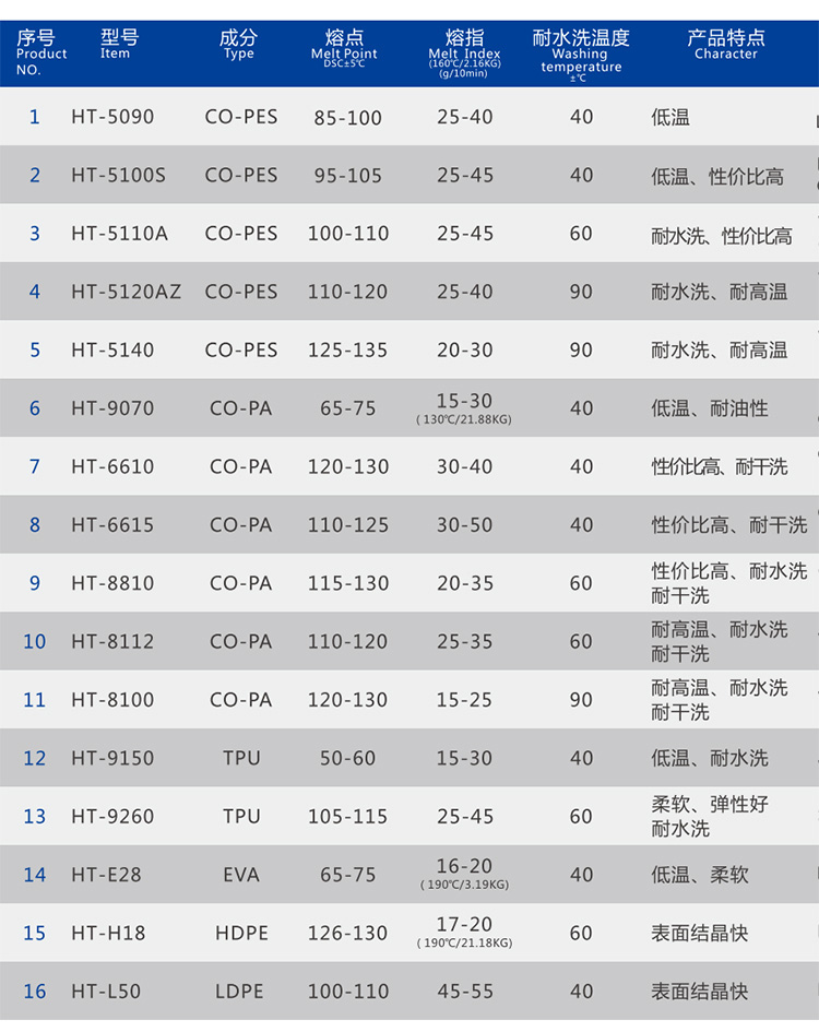 該產(chǎn)品具有粘合強(qiáng)度高,手感柔軟,回彈性好的優(yōu)良特性,廣泛應(yīng)用于彈性紡織品、皮革、鞋材和地毯的復(fù)合及熱轉(zhuǎn)印行業(yè)。